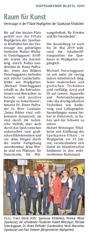 Wir können uns von Michael Unterluggauer noch viel erwarten, er lebt zwar jetzt in Oberösterreich, aber die Beziehung zu Tirol wird nicht abreißen. Ich wünsche für das Schaffen weiterhin so viel Inspiration und so viel Empathie, das brauchen wir alle - die Kunst, die dann unsere Seele und nicht nur unsere Augen erreicht. Das ist die, die das Land Tirol haben will, die ich haben will und ich glaube alle Zuseher und Betrachter heute auch.